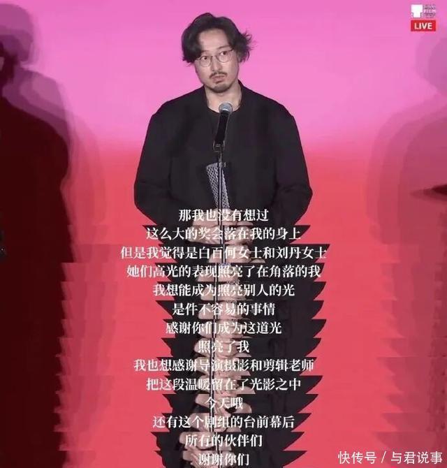 发言最后,王传君还感谢了妻子齐溪和两个女儿:“我想感谢我的太太和我两个女儿,我太太是比我更优秀的演员。我想起我女儿有一次非常认真地跟我说‘爸爸你好酷啊’,她说‘我最喜欢爸爸了’,其实那一刻我开始意识到,我自己也已经变成别人的光了。所以我会带着这个奖,勇敢的继续努力下去。”