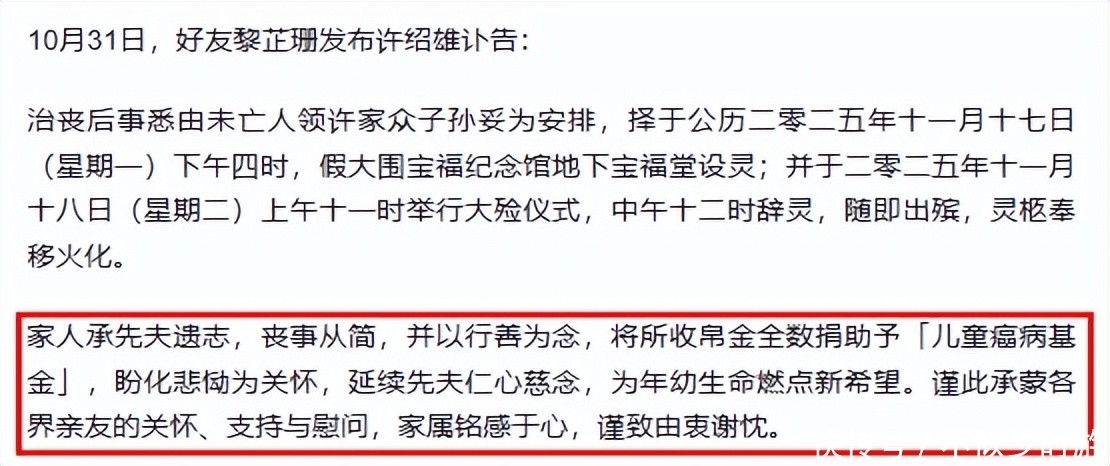 关于身后事,家人明确表示葬礼收到的所有帛金将全额捐赠给儿童癌病基金。
